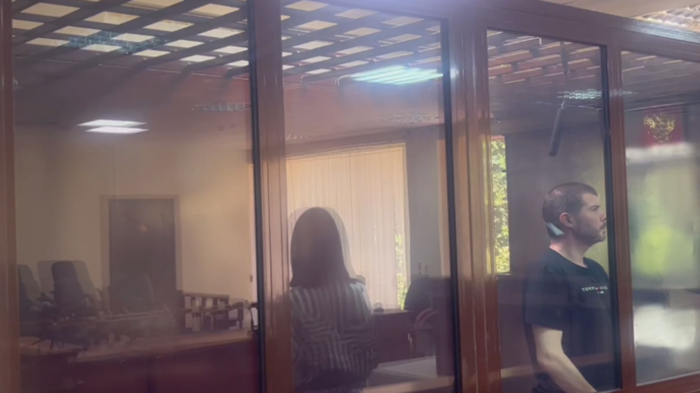 The Prosecutor's Office published an 8-second video showing Fr Kostiantyn in the defendant's glass box in the courtroom at the Crimean Supreme Court. A woman reflected in the glass presumably was Fr Kostiantyn's state-appointed lawyer. No one else is visible in the video.