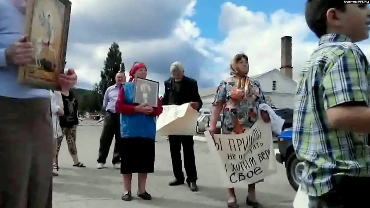 Но на улице, перед церковью, прихожан ожидали люди с плакатами, на которых было написано – «Иван Катькало – провокатор», «Нет Правому сектору в Крыму». По словам очевидцев, женщины и дети с плакатами появились вместе с крымской «самообороной».